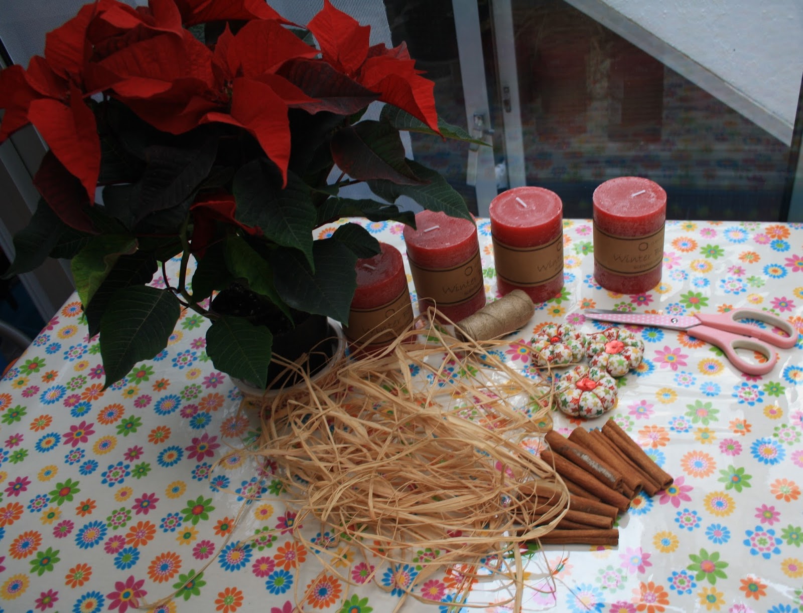Executei mais umas velas, nada mais, que um simples tecido de natal, enchimento, fio sisal, botões e paus de canela... mãos à obra!