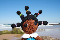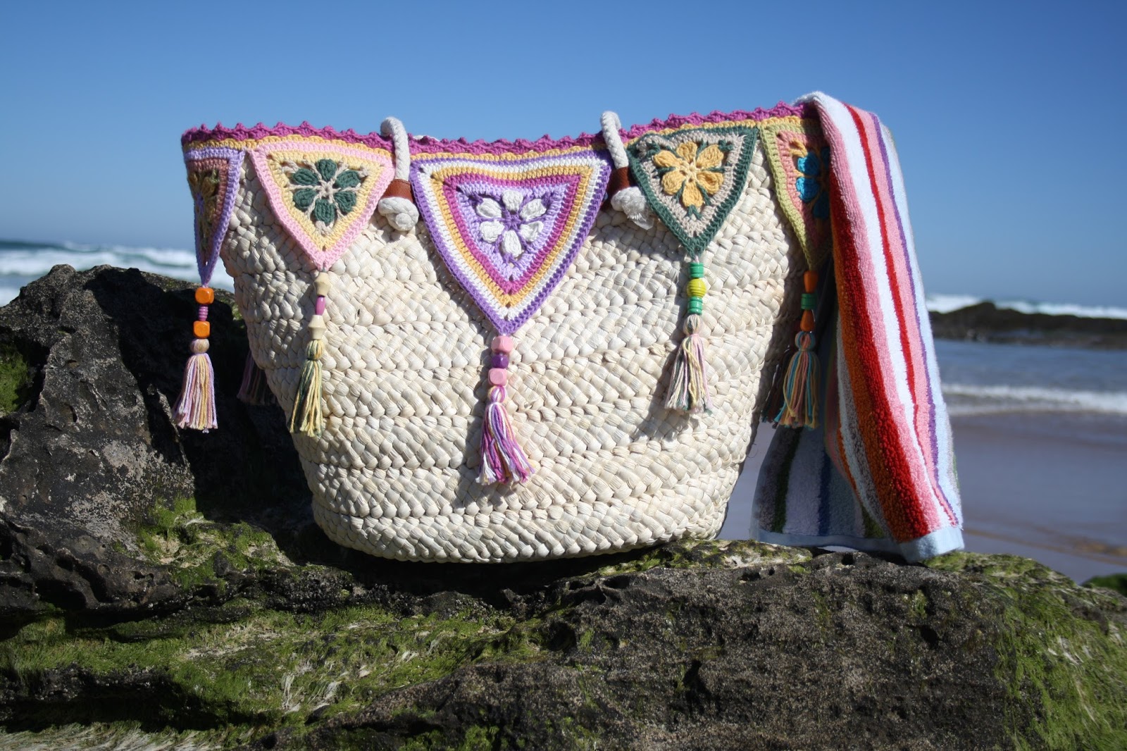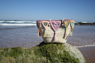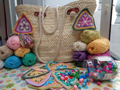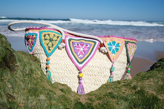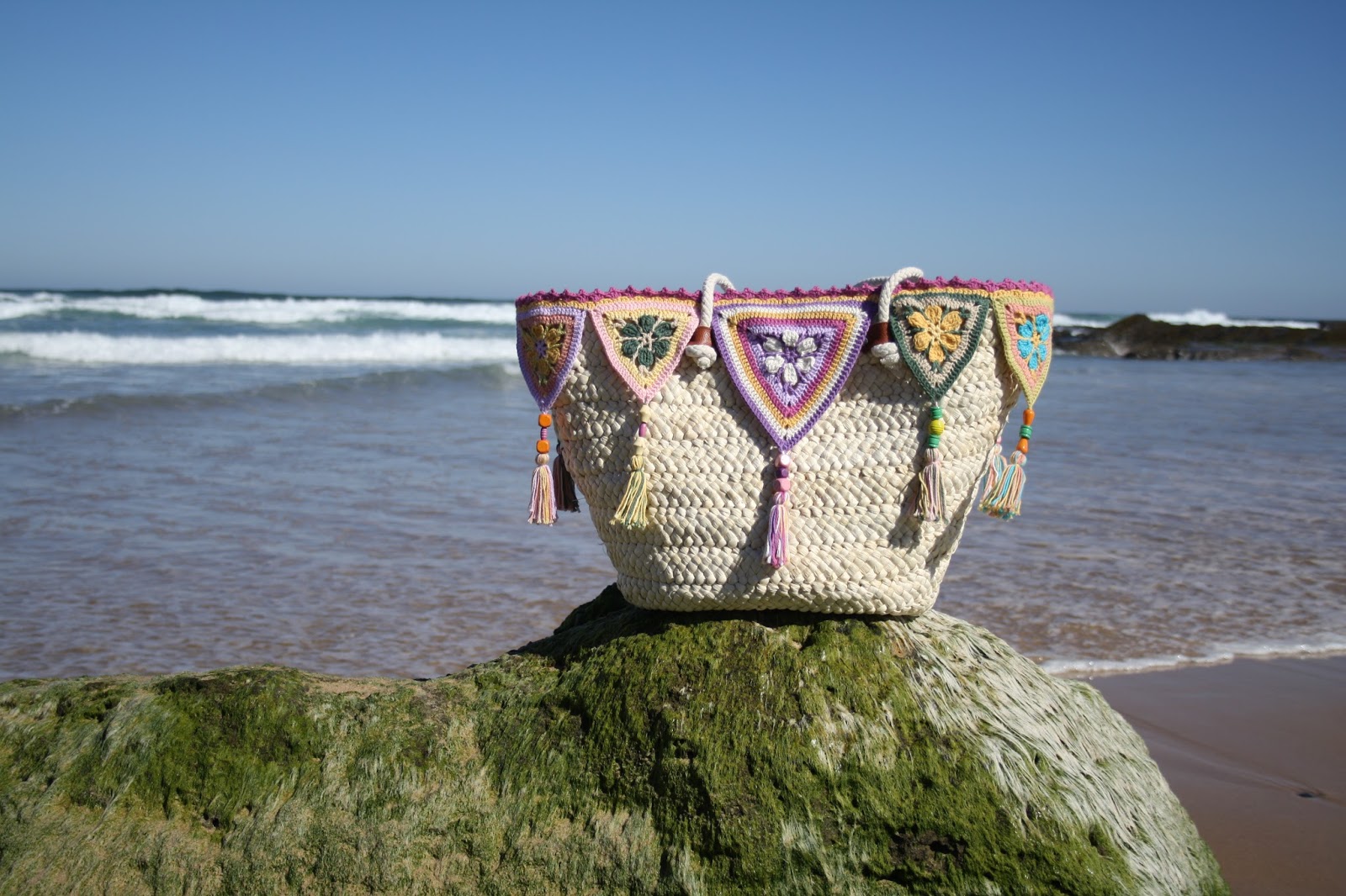 Forrei botões e fiz umas flores em crochet, só para dar um pouco de vida à mala.