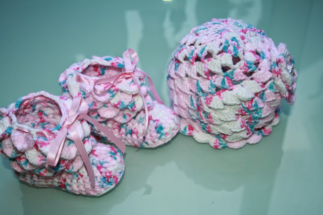 Pediram-me para elaborar umas botas e um gorro de bebé recém nascido, não hesitei e decidi fazer umas botinhas em ponto crocodilo, uma touquinha e aproveitando o resto da lã fiz um dudu.