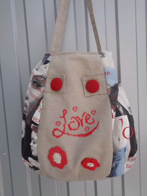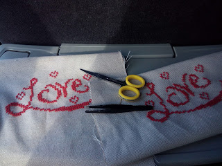 Com o andar da carruagem, pensei em bordar em ponto cruz a palavra "Love", em linha DMC em vermelho, que achei no meu ver que ficava muito bem enquadrado na parte da frente da mala.