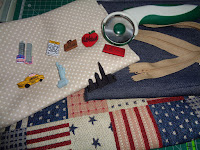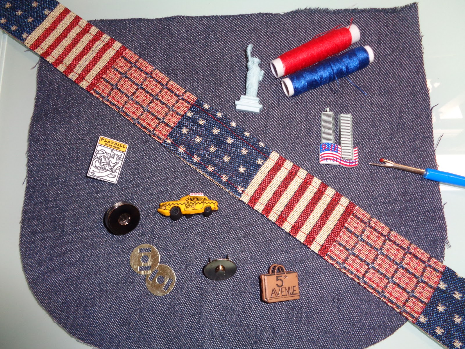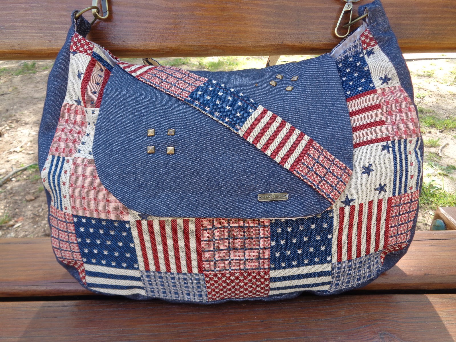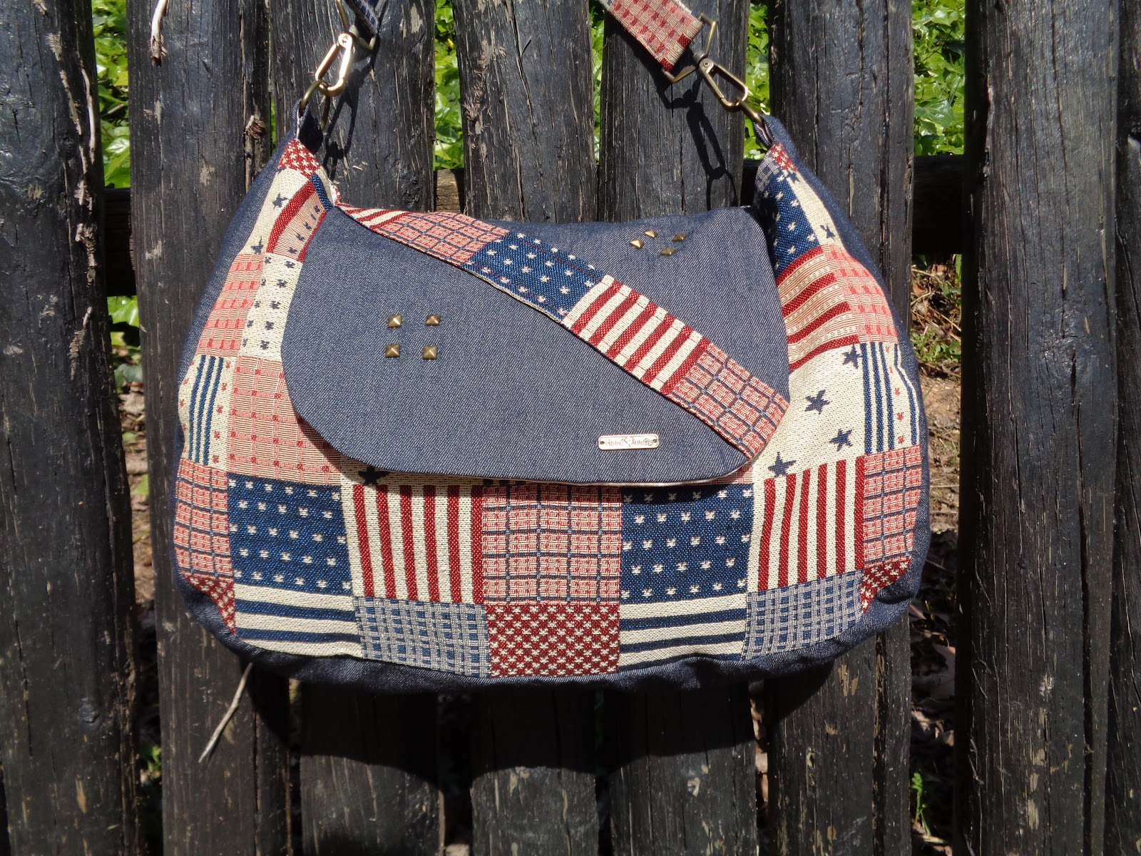 Idealizei esta mala com este tecido meio americano, estava a contar colocar estes botões dentro do mesmo género na pala da mala, mas achei um pouco pesado, então acabei por retirar isso da tola e aplicar apenas uns pins e nada mais, penso que ficou mais leve e simples.