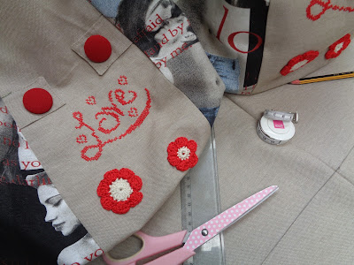 Forrei botões e fiz umas flores em crochet, só para dar um pouco de vida à mala.